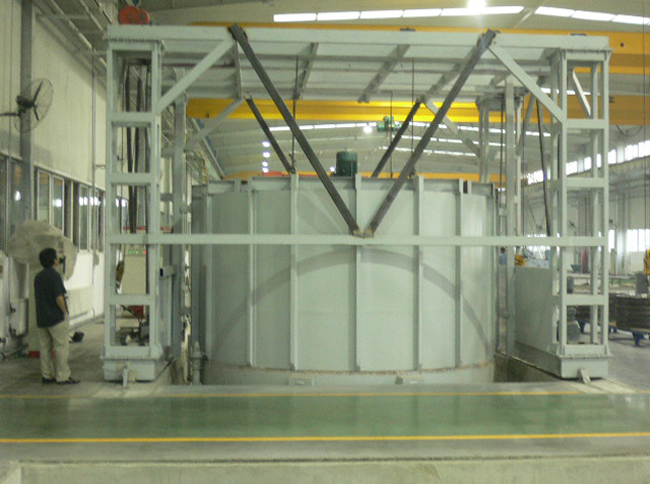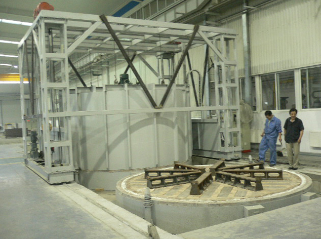 加熱元件選用高溫電阻合金絲繞制成螺旋狀,散布 在 爐側、爐門、后墻及安放臺車擱絲磚上,并用國標插口磚固定, 安全簡練。臺車上安裝有耐壓抗高溫的鑄鋼爐底板,以承載工 件之用。為了防止工件加熱后 產生的氧化皮經過爐底板間的縫 隙落入加熱元件周圍而造成加熱元件損壞,罩式淬火爐因此爐底板 與爐體觸摸處選用刺進式觸摸。為正常運用,需求經常吹掃臺車爐底板下方的氧化皮一般每周吹掃一次,吹掃時將爐底板 吊起,用壓縮空氣將電阻絲槽內的氧化皮屑吹掃干凈,留意防 止氧化皮卡在爐絲內引起短。爐門設備 由爐門、爐門提升組織 和爐門壓緊設備組成。爐門殼體由型鋼與板材焊接而成牢固框 架構造,內用耐火纖維模塊疊鋪而成,要求保溫性能好,重量輕等。